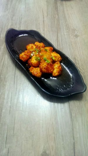 豆腐油煎好后,盛出,国内倒入番茄沫,炒至粘稠,再倒入豆腐,翻炒一会儿,倒入料汁,直至收汁,起锅,装盘,最后撒上一点葱沫装饰。
