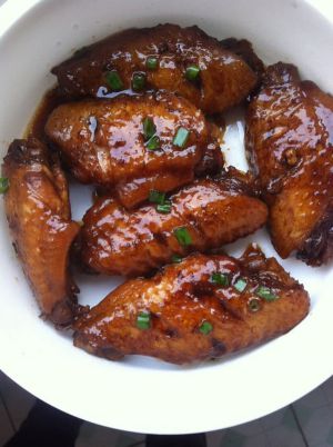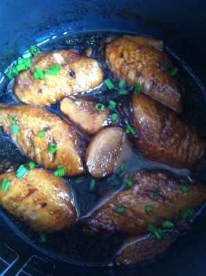 炖至汁水收的差不多而鸡翅根颜色也上得差不多的时候翻一下,也可撒上切好的绿葱点缀,就可出盘
