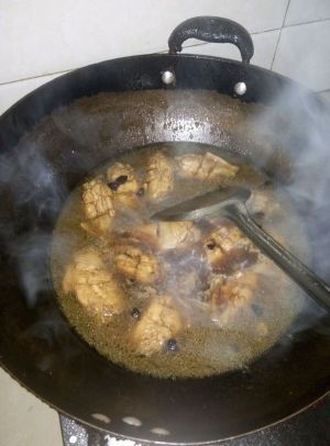 烧完鸡翅差不多,倒上可乐一瓶,酱油加进去,盖上锅盖。