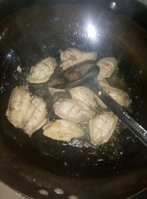 放入鸡翅,翻炒使鸡翅上色,加盐。
