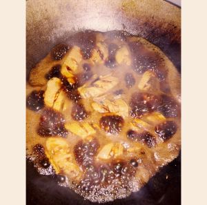 倒入一瓶可乐,(可乐按照个人喜好添加,本人喜欢甜些)可乐没过鸡翅,放入酱油,(酱油上色)准备好的姜片,八角。中火炖15分钟,大火收汁。