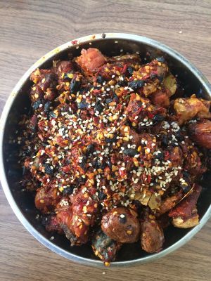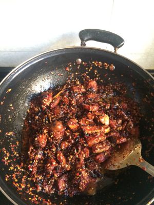 将除芝麻及辣椒粉外的香料及豆豉放入稍冷却油内,开小火慢慢爆香,有香味后放入辣椒粉和炸好的鱼块,加入酱油耗油香醋盐这些调味料,一定要控制辣椒拌炒的过程,保持小火,注意不要烧糊了!