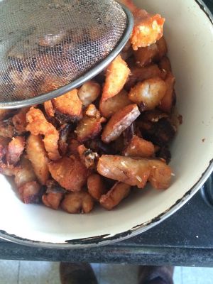 炸好的鱼块捞起放入碗中,锅内炸鱼的油放锅内稍稍冷却,如果国内有残渣一定要捞起除去,免得烧糊,等锅内炸鱼油稍冷,这个描述比较主观,主要是为了稍后放辣椒不会一下锅就烧了。