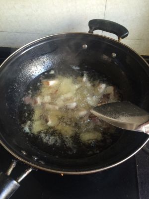 倒入菜籽油,油量要多一点,油烧至八成热(未冒烟)时下鱼块,鱼块刚下锅时不激烈的翻搅防止鱼块碎散,只需轻轻铲动锅底,防止粘锅