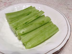 黄瓜去皮后,切成大小合适的条,码盘备用。
