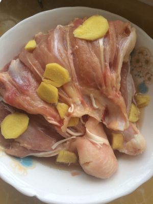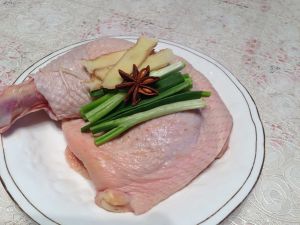 把鸡腿~用姜片~葱段~香叶~桂皮~加少许盐~煮熟~