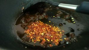 去掉蒜末和花椒,在油中加入做好的豆瓣,辣椒面,小火炒