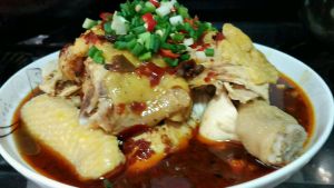 鸡肉捞出,去骨切成大片,放入盘中,浇上拌好的汁,切一些小葱撒上,完成。