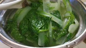 煮过鸡的汤加入菜叶,淋几滴香油,适量盐,清肠的素菜汤也做好了