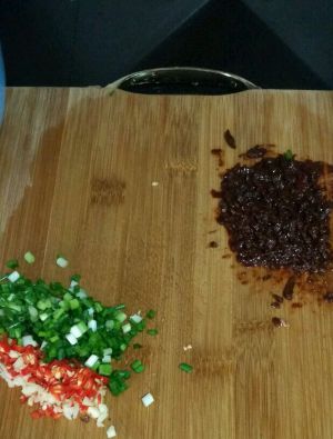煮鸡的同时,切葱花、小米椒待用,豆瓣我喜欢用娟城牌郫县豆瓣,比较粗需要宰细一点,备用