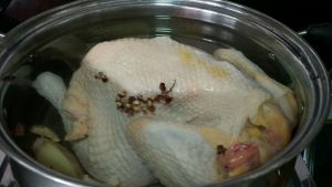 一整只鸡洗净放锅里加水,水没过鸡就行,放几粒花椒,少许料酒,姜片,开火煮,待水开,将火关小,汤面有浮沫将之去掉,煮十五分钟