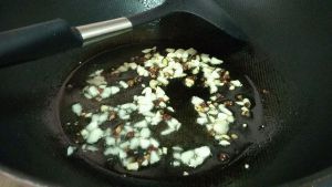放少许油,加入备好的蒜末和花椒,小火煸出香味,至蒜末变黄
