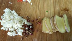 姜洗净切片,蒜切末,花椒少许,备好待用