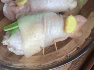 取出,取掉牙签,切小块,蒸完后的鸡汁带入调好的汁里