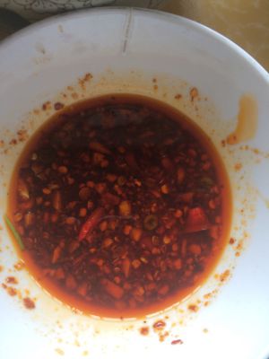 取小碗放两勺花椒,锅里放半碗油,油开关火,先把花椒炸香,放三勺油到花椒碗里,把花椒捞出不要。再取小碗放三勺辣椒粉,把剰于的油倒到辣椒粉里,取只大一点的碗,倒入花椒油,辣椒油,生抽,半碗鸡汤,盐,醋,香油,蒜沫。