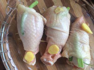 大鸡腿剔骨放入碗中,倒入安佳纯牛奶,葱姜混合均匀后腌制3小时以上,不过我一般是前一天晚上腌制好后放在冰箱里,腌制一晚上,第二天再拿出来制作!