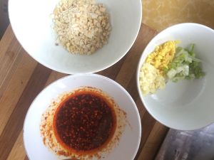 准备好材料 辣椒油、花生碎、葱姜蒜