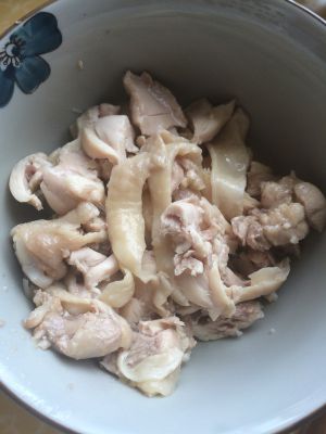 鸡腿株熟后~用凉水拔透~切成条放在盘子里~把调好的口水汁淋上!~