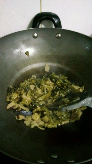 锅里放油,油热放酸菜饭,翻炒