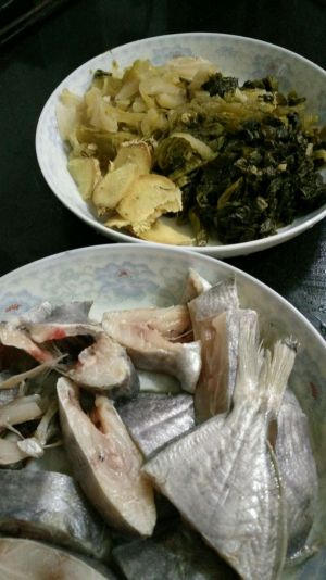武昌鱼切条,酸菜切细丝,姜切片,备用。