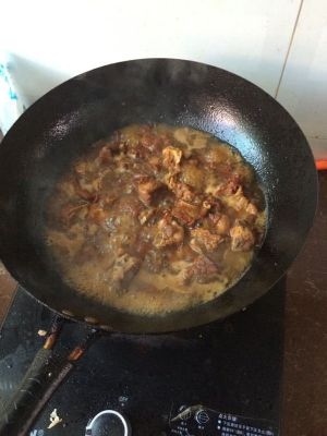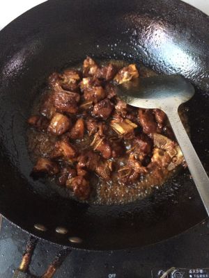 改小火烧到糖水都是泡,放入排骨,翻炒均匀。