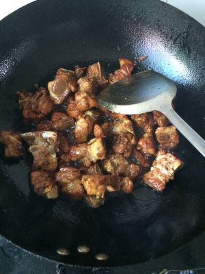 倒入排骨小火翻炒,是其均匀着色。再加入适量醋、生抽、盐,少量老抽,具体比例尝一尝就知道了~