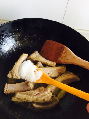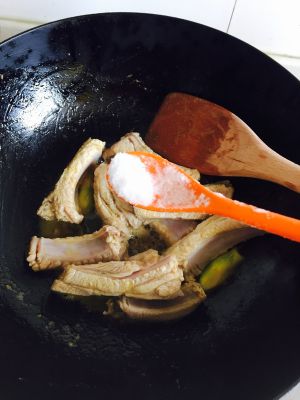 锅里倒入菜油,等油热了把排骨姜倒入锅内翻炒几分钟