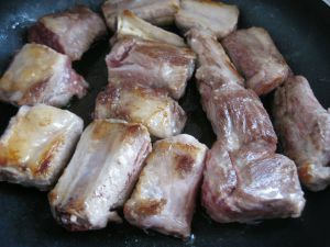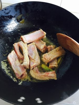 锅里倒一点点底油,把排骨放进去煎一下,如果你不想煎的话,也可以把排骨焯一下水。同时把姜切片,葱切大段。