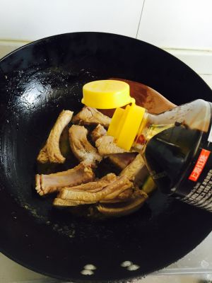 水开后把排骨放入锅中加入适量姜片,料酒,生抽(本来应该是煮排骨前先加入调料入味的,结果忘记了,但是这样做也很好)煮40分钟左右。排骨捞出,汤汁待用。