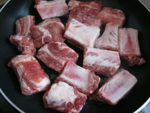 先把排骨用水泡一泡,洗一洗,把血水洗出。