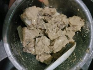 平底不粘锅中倒入油(比平时炒菜多一倍),大火加热,待油7成热时改成中火,倒入排骨块,用筷子边翻动边煎。煎至排骨变熟,颜色为浅棕色后,将排骨捞出