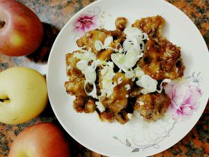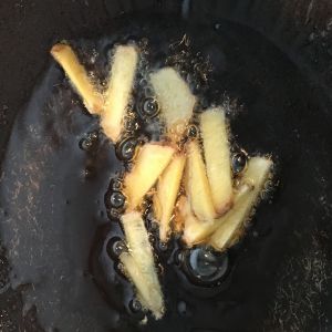 把适量的糖,醋,酱油放入锅中!煸炒。