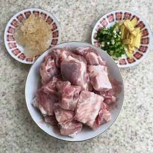 将肋排切成4cm长的小块,放入大碗中,调入料酒,1汤匙生抽搅匀后,盖上盖子,或保鲜膜,腌制20分钟。姜去皮切成片。大葱切成段备用