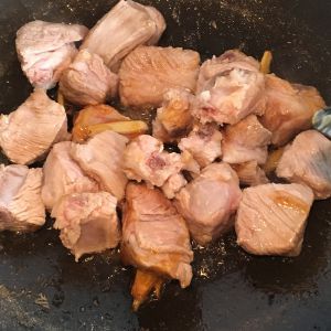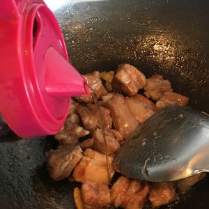 大火翻炒后(1 分钟)再倒入佐料翻炒3-5分钟,看锅里的排骨全部上色加入适量水,转小火煮20-30 分钟即可转大火收汁