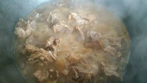 加入生姜五六片,料酒:生抽:醋按照1:2:4加入,根据排骨多少酌量添加。添加开水至没过排骨,调匀锅内汤汁和排骨。转中火,盖好锅盖烧煮约半小时。