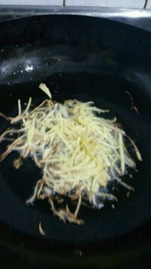 姜丝切细一点,放油在锅里小火煸上色。不要煸胡了,上颜色发焦的感觉就可以,也就是最大限度的去掉姜丝的水分。