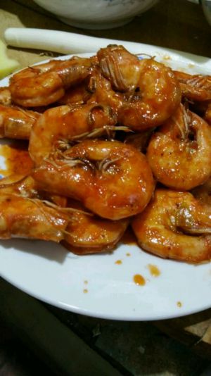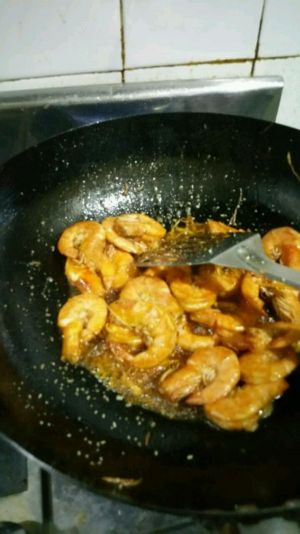 稍微变红后加入适量酱油 再炒 加入水 沫过大虾即可 加盐 少许糖 收汁 出锅时洒香菜沫 鲜大虾就可以吃啦