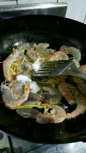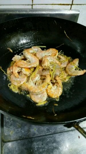 锅中放油 热油放入葱姜 暴香 将大虾放入锅中煸炒