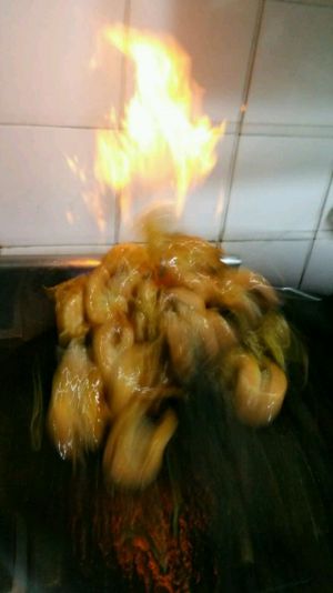 蘸少许水进油锅盖上盖子稍稍焖煮一下,保证虾熟透,然后开盖倒入生抽再次翻煸待虾入味。