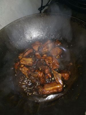 水被靠的差不多了。排骨的油也出来了,转大火爆炒收汤。