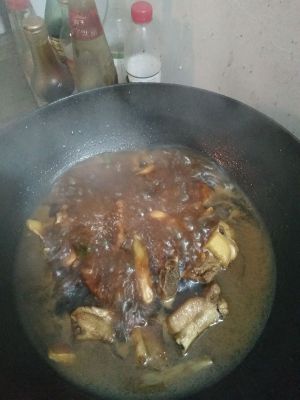 葱、姜、炒香,依次放生抽、老抽、料酒、糖、醋、水