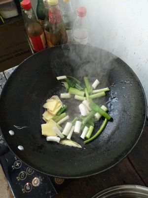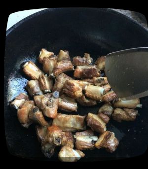 炸好的排骨出锅 倒入少量油 油热后放入葱姜 炝锅 再放入炸好的排骨 翻炒几下 添水 直至淹没排骨