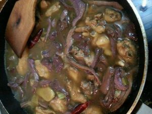 煸炒至鸡肉水份收干,再加入八角和桂皮。
