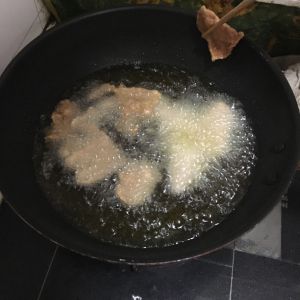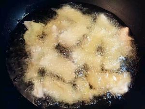 油烧成6成热,肉片一片一片下到油锅。要是锅小油少可以少放几片,分几次炸。炸到肉片发白就可以捞出来了。要保证肉片是展开一片一片的,不要连在一起。肉再次烧热到九成熟,复炸肉片至金黄,捞出待用。
