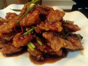 重新拿一个炒勺,少许油,加热,炒香葱丝等。调入汁,糖化后变的粘稠,这时放入炸好的肉片,把肉片裹汁后即可出锅。