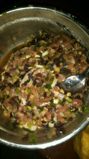 把腩肉剁蓉,干冬菇用热水浸一会,捞起挤干水分,切碎,胡罗卜切碎,放盐,鸡精,生抽一起拌均匀