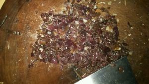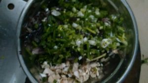 把葱花切碎,把香菇剁碎,全部放在一块。