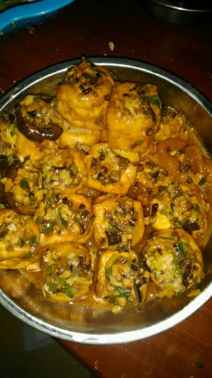 把豆腐弄个洞往里填肉馅,一定填实。香菇的放底下了没拍到。