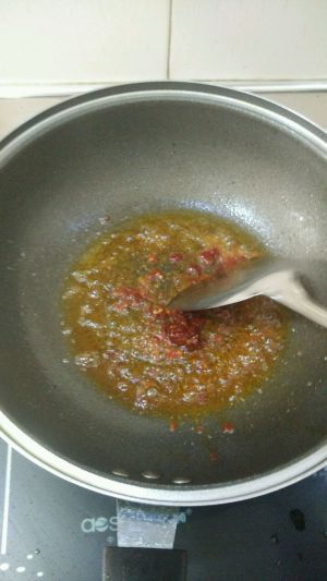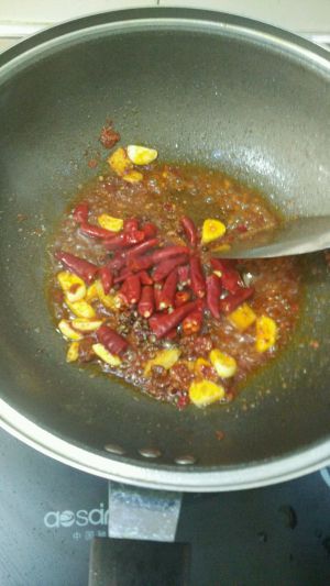 加入大蒜姜片爆香加入辣椒和花椒爆香