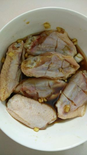 鸡翅洗净沥水后腌制20分钟左右,配料有料酒,生抽,姜末葱末黑胡椒,可根据自己的口味适当添加调料